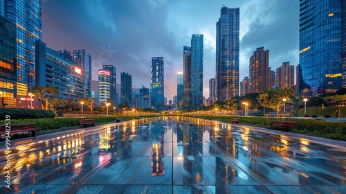 © Arifin Studio, Obraz premium City square and modern high-rise buildings, night view