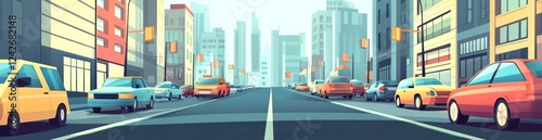 © BerkahStock, Fototapeta premium City street scene with cars and buildings.