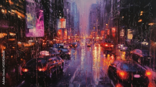 © Azahrul, Obraz premium City street view at night during a rainstorm presents cars