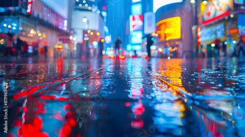Obraz premium City street with lights reflecting on wet pavement, blurred background showing people walking and buildings in the rain at night, depth of field effect.