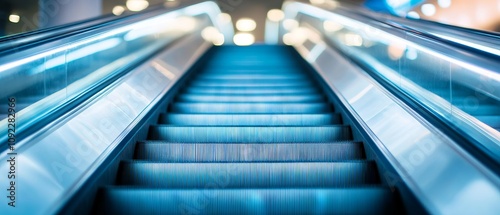 © hassan, Obraz premium City subway escalator in motion with light blue background and blurred urban infrastructure
