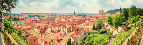 Fototapeta premium City summer landscape, panorama, banner - top view of the Mala Strana (Little Side) of the historical district of Prague, Czech Republic