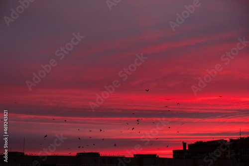 © Maksim Shebeko, Obraz premium city sunrise close up red sky