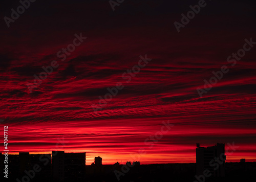 © Maksim Shebeko, Fototapeta premium city sunrise close up red sky