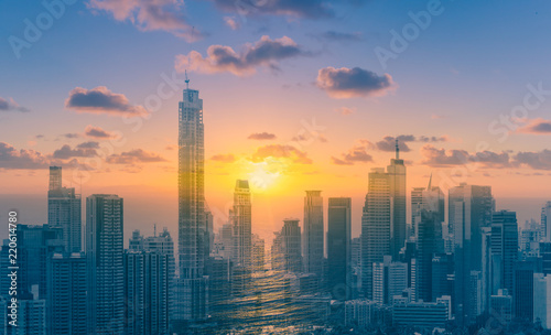 © kieferpix, Fototapeta premium City sunset skyline. Double exposure.