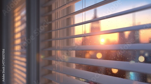© BapakCreative, Obraz premium City Sunset Through White Blinds