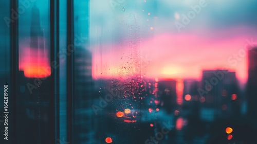 © Wayuu, Fototapeta premium City sunset viewed through rain-streaked glass