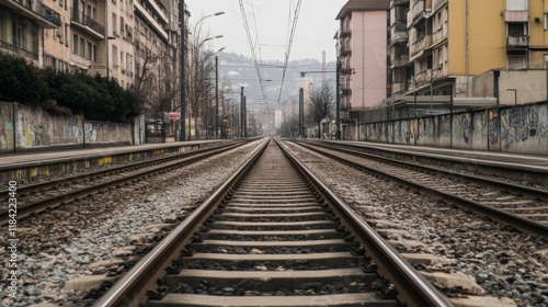 © musa, Fototapeta premium City train tracks vanishing point perspective.