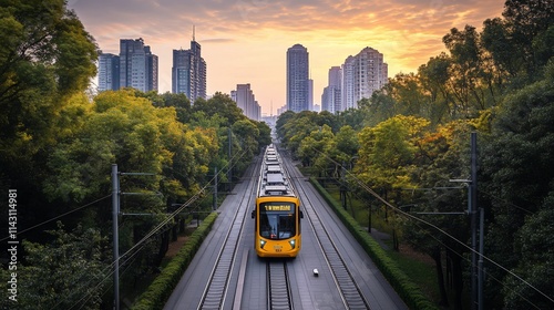 © Saripudin, Fototapeta premium City tram at sunrise, travelling through a tree-lined avenue towards skyscrapers.