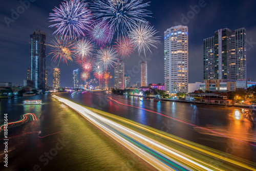 © Boonchai, Fototapeta premium city view and Bangkok with beautiful fireworks