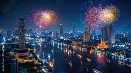 © arthit, Obraz premium city view and Bangkok with beautiful fireworks -
