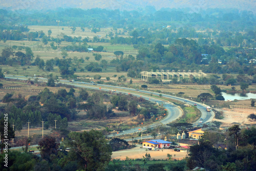 © njmucc, Obraz premium City view and village road, bird eye view