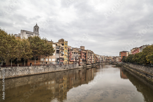 Naklejka premium City view, colored houses over river, autumn day, Girona, Catalonia,Spain.