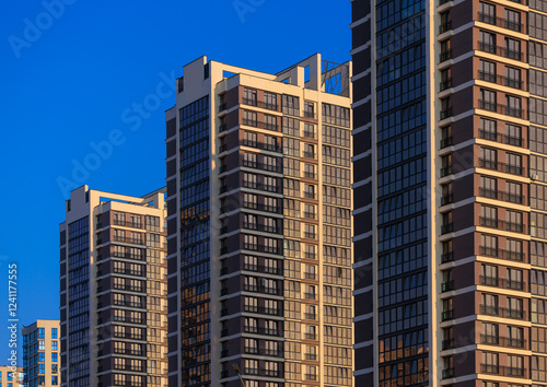 © Tatiana, Obraz premium City view on a sunny day. Modern buildings, walls and windows.