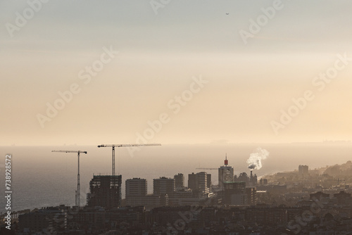 Fototapeta premium City view, sunset, smoke, crane, construction, pollution