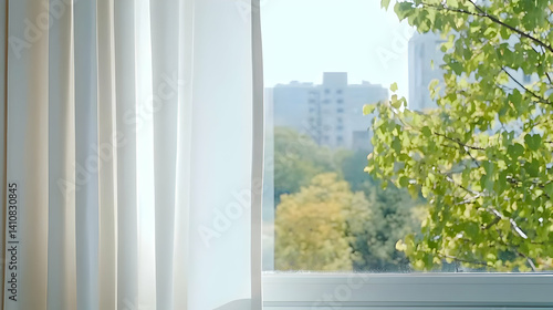 © artzone, Obraz premium City View Through White Sheer Curtains