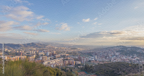 © Sergei, Obraz premium City view with a cloudy sky and a mountain in the background