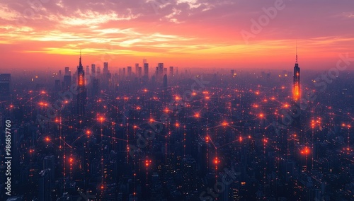 © redflower, Fototapeta premium City View with Communication Towers and Glowing Lines
