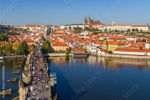 © Ekaterina, Fototapeta premium City views Prague autumn. Tiled roofs. The Charles Bridge. Vlatva river. People and Harvesting Equipment. View from above.