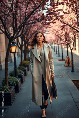 © Thanawadee, Fototapeta premium City Walk: Elegant Woman Explores Springtime City