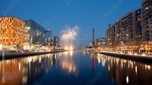 © rehan, Fototapeta premium City waterfront at twilight with fireworks.