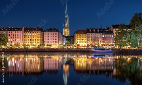 Fototapeta premium City waterfront with illuminated buildings, church spire, and reflections at...
