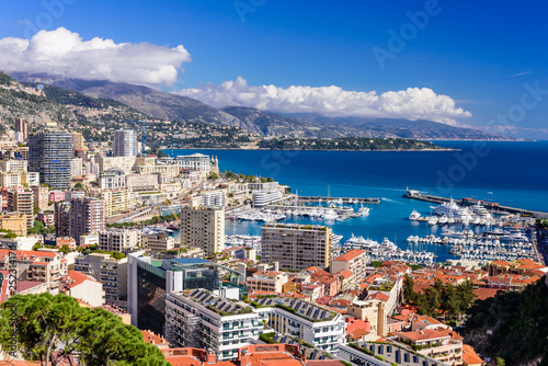 Obraz premium Cityscape and harbor of Monte Carlo. Aerial view of Monaco on a Sunny day, Monte Carlo, Principality of Monaco