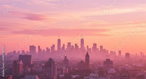 © Bujur Mujur, Fototapeta premium Cityscape at Dawn with Skyline and Soft Pink Sky