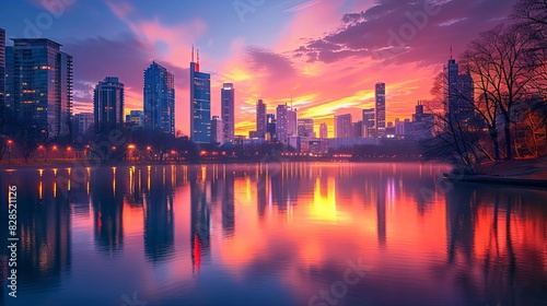 © Nawarit, Fototapeta premium Cityscape at dawn with skyscrapers bathed in the soft glow of the rising sun, reflecting off the calm river below