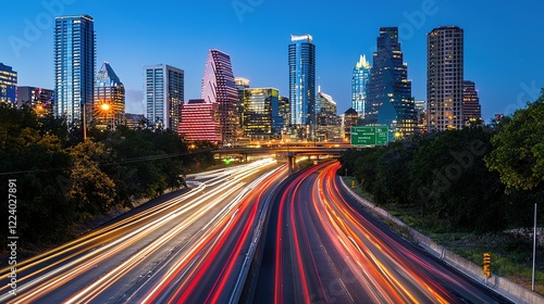 © Sunroft, Fototapeta premium Cityscape at Dusk: Highway Light Trails