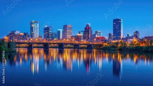© Berkah1789, Obraz premium Cityscape at Dusk Reflecting in Calm Water