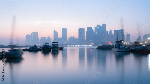 © Peter, Fototapeta premium Cityscape at Dusk with Boats in the Foreground