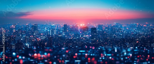 © Conan, Fototapeta premium Cityscape at Dusk with Bokeh Lights
