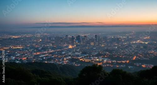 © Richafuji, Obraz premium Cityscape at dusk with city lights twinkling against a twilight sky over buildings and foliage in the foreground