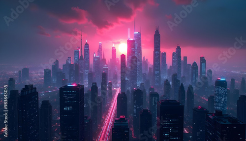 © Aksaka, Fototapeta premium Cityscape at Dusk with Pink Sky and Street Lights