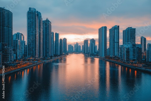 Fototapeta premium Cityscape at Dusk with Reflections in a Calm River