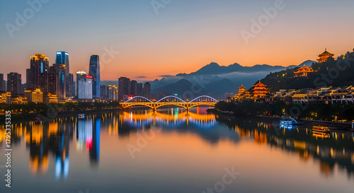 © Sid, Fototapeta premium Cityscape at dusk with reflections on calm water