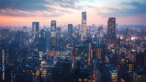 Naklejka premium Cityscape at Dusk with Vibrant Sky and Illuminated Buildings.