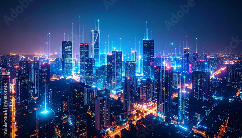 Obraz premium Cityscape at Night: An exciting cityscape at night showcasing connected technology, a bright network spanning across towering buildings.