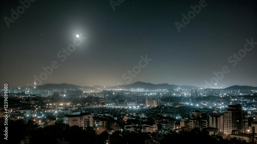 Fototapeta premium Cityscape at Night Illuminates Under the Moonlight with Stars Shining Brightly Above Quietly.