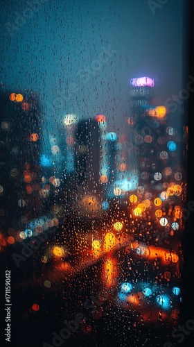 Obraz premium Cityscape At Night Through Rainy Window