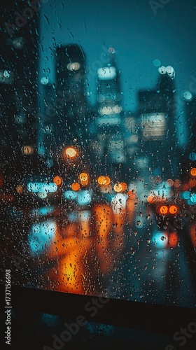 © Zamm Ahmad, Obraz premium Cityscape At Night Through Rainy Window