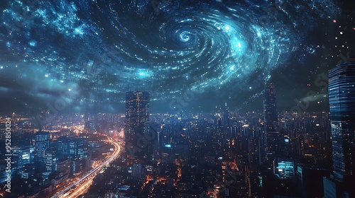 © Handz, Fototapeta premium Cityscape at Night with a Twirling Starry Sky
