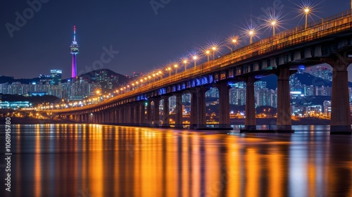 © Puttipong, Fototapeta premium Cityscape at Night with Bridge and Tower in Skyline