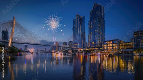 Obraz premium Cityscape at Night with Fireworks and Reflection