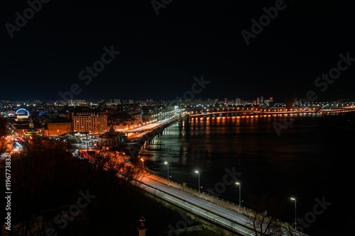 © Wirestock, Fototapeta premium Cityscape at night with illuminated bridge and river reflections.