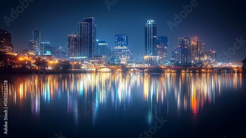 Fototapeta premium Cityscape At Night With Illuminated Buildings Reflecting In Calm Water