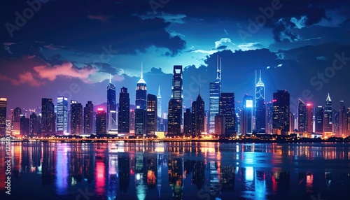 Fototapeta premium Cityscape at Night with Illuminated Skyscrapers Reflecting in Water Under...