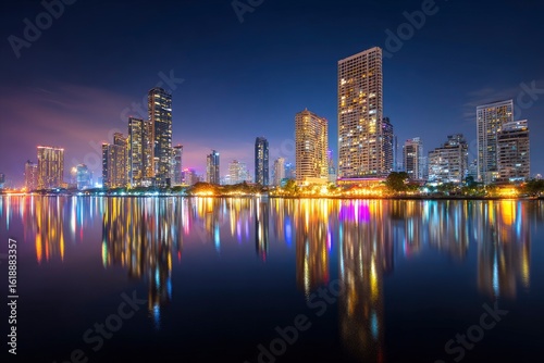 Fototapeta premium Cityscape at night with tall buildings reflected in the dark water lights...