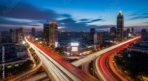 © Jasmani, Obraz premium Cityscape at Night with Traffic Trails and Modern Architecture.